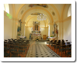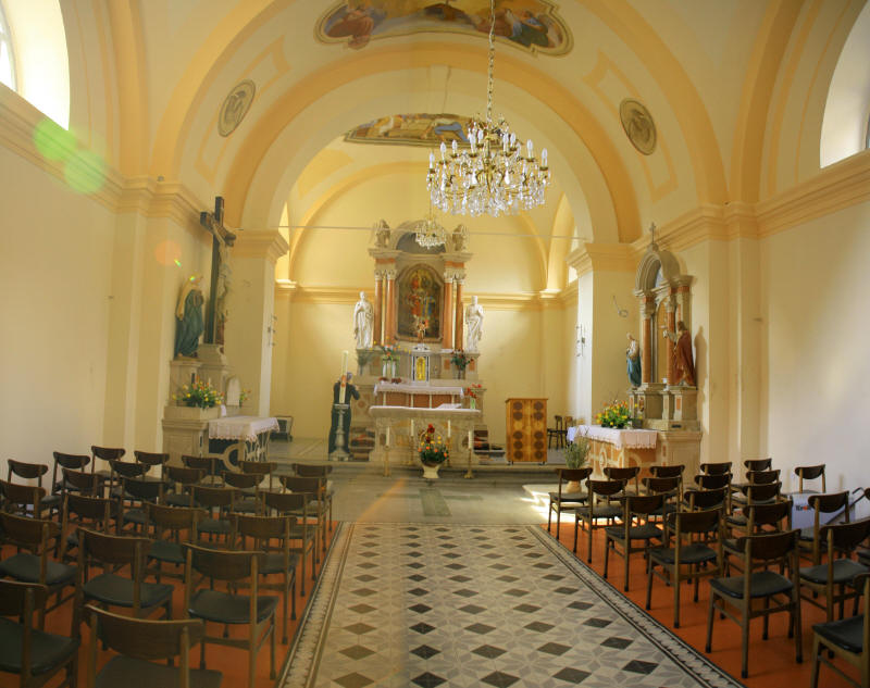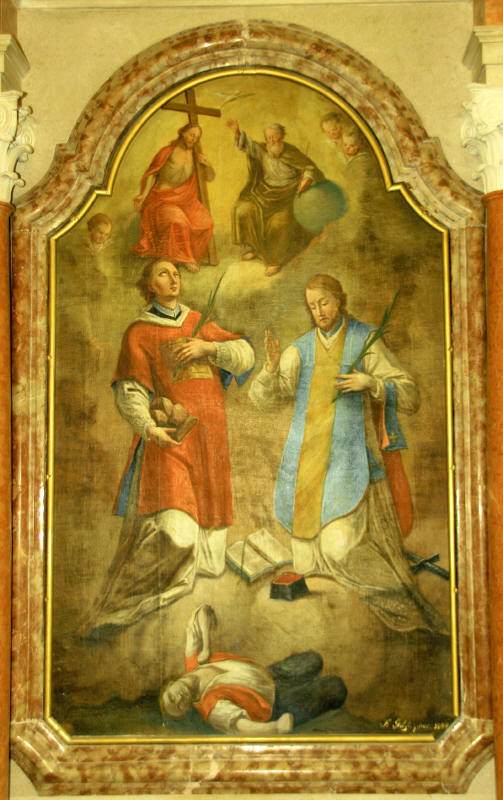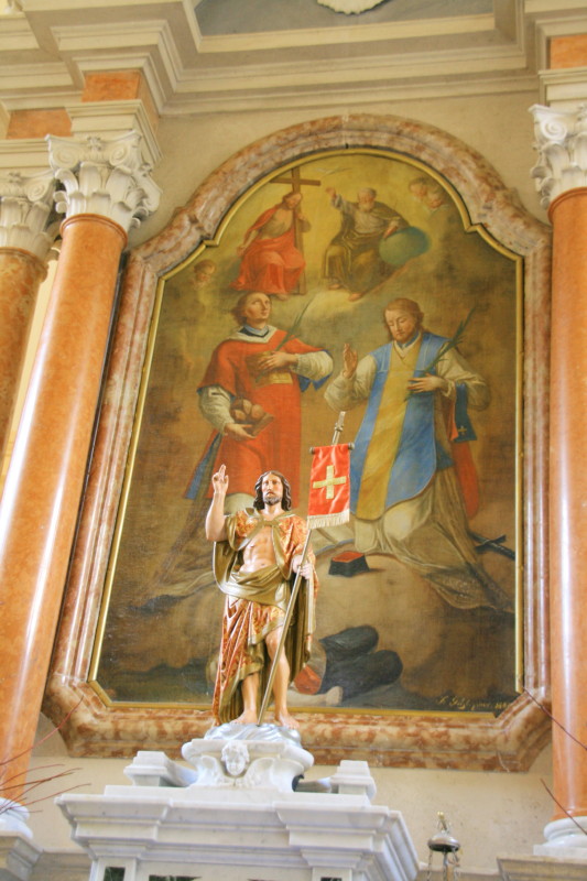 Od oltarjev velja omeniti glavnega, ki je bržkone delo kakšne od beneških ali furlanskih delavnic, nastalo najverjetneje v drugi četrtini XIX. stoletja. Oltarna slika, ki prikazuje sv. Štefana in Valentina, ki bolnika priporočata sveti Trojici, je nastala leta 1844 v kranjski delavnici bratov Göetzl, o čemer priča tako njeno razkrajanje tradicije baročenga slikarstva, ki sta ga po togih formulah ponavljala za učiteljem Leopoldom Layerjem, kakor tudi signatura in datacija.