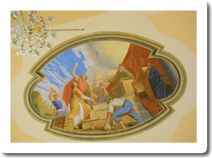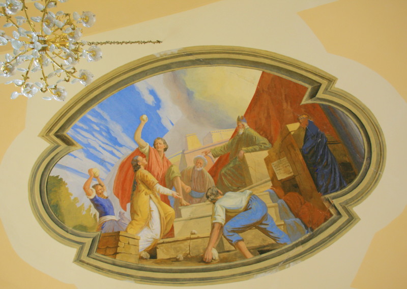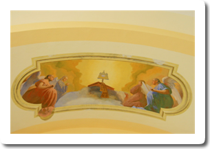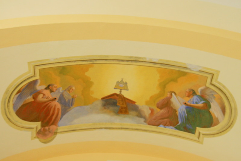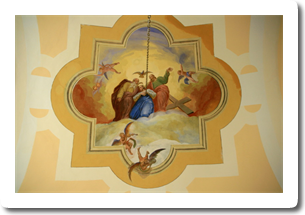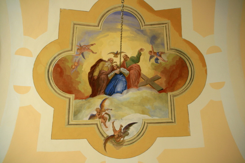 Na oboku prezbiterija je odprl pogled na mučeništvo loškega patrona, prvega krščanskega mučenca, sv. Štefana, pred slavolokom je dal prostor angeloma, da počastita sveto rešnje telo, skozi ladijski obok pa hitita angela godca med ljudi oznanjat Marijino kronanje.